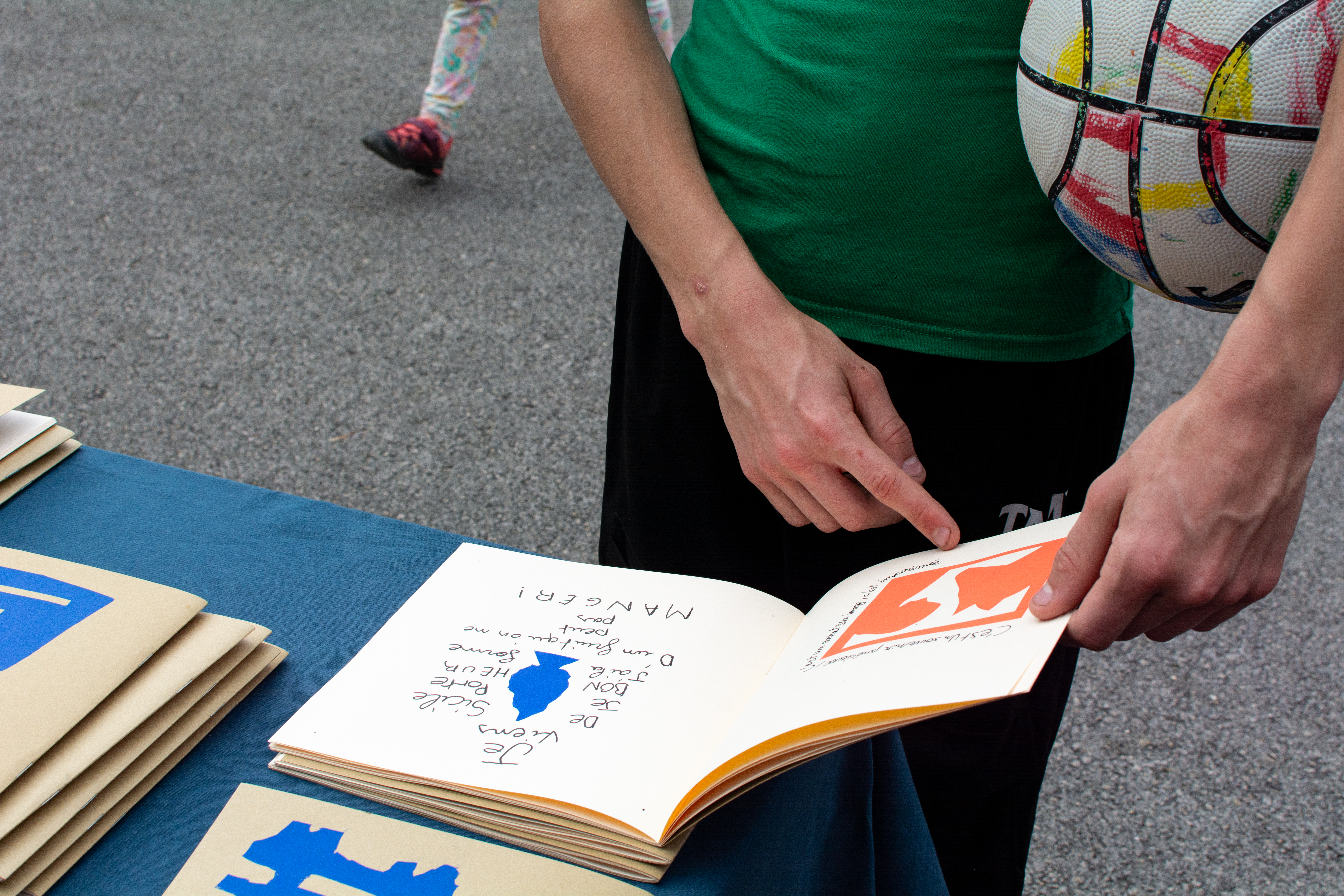 Au fil d’une vingtaine d’heures d’ateliers, ce travail collectif a permis la création de 22 devinettes illustrées, d’un livret sérigraphié en 50 exemplaires, ainsi que d’une fresque peinte dans la cour du collége.