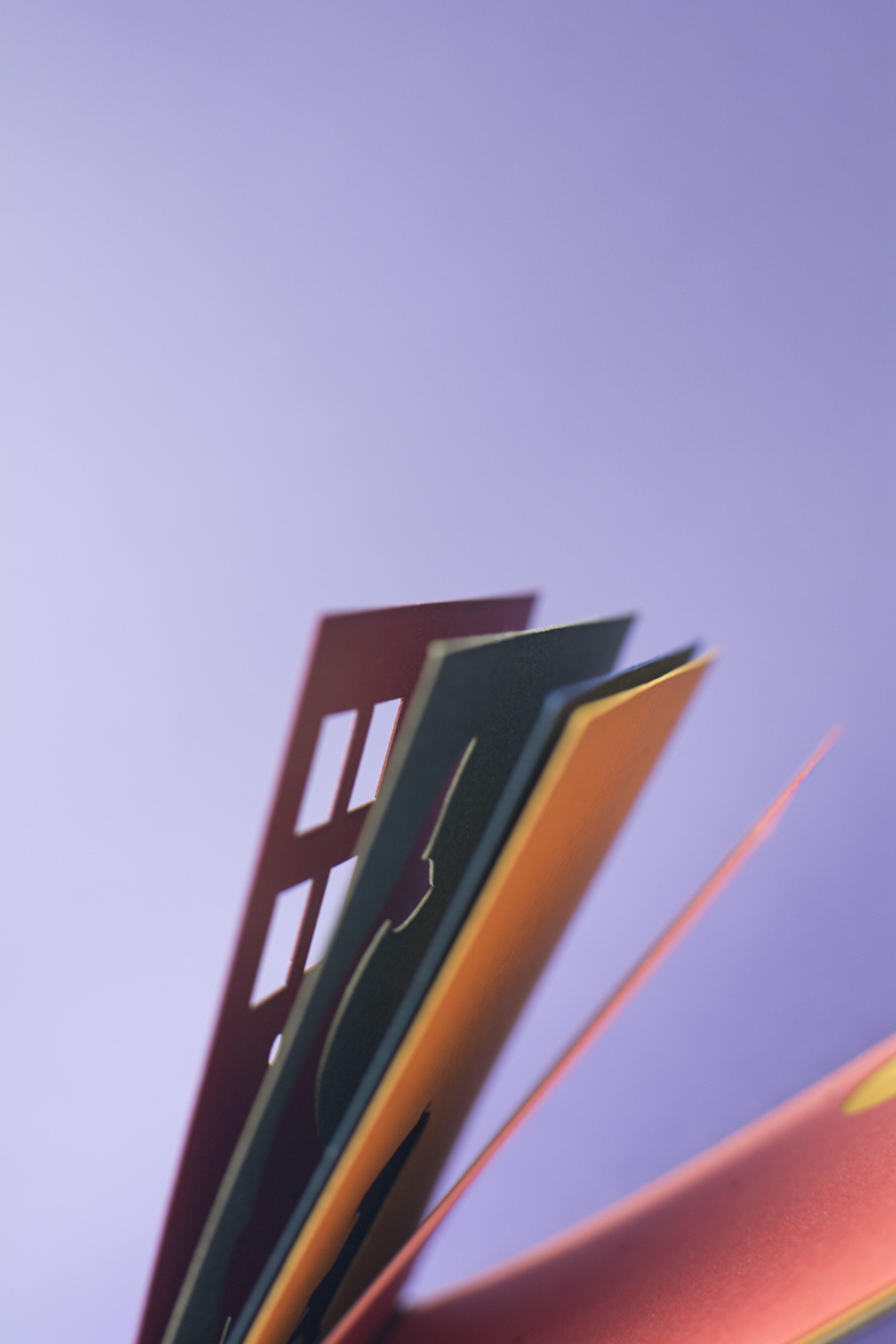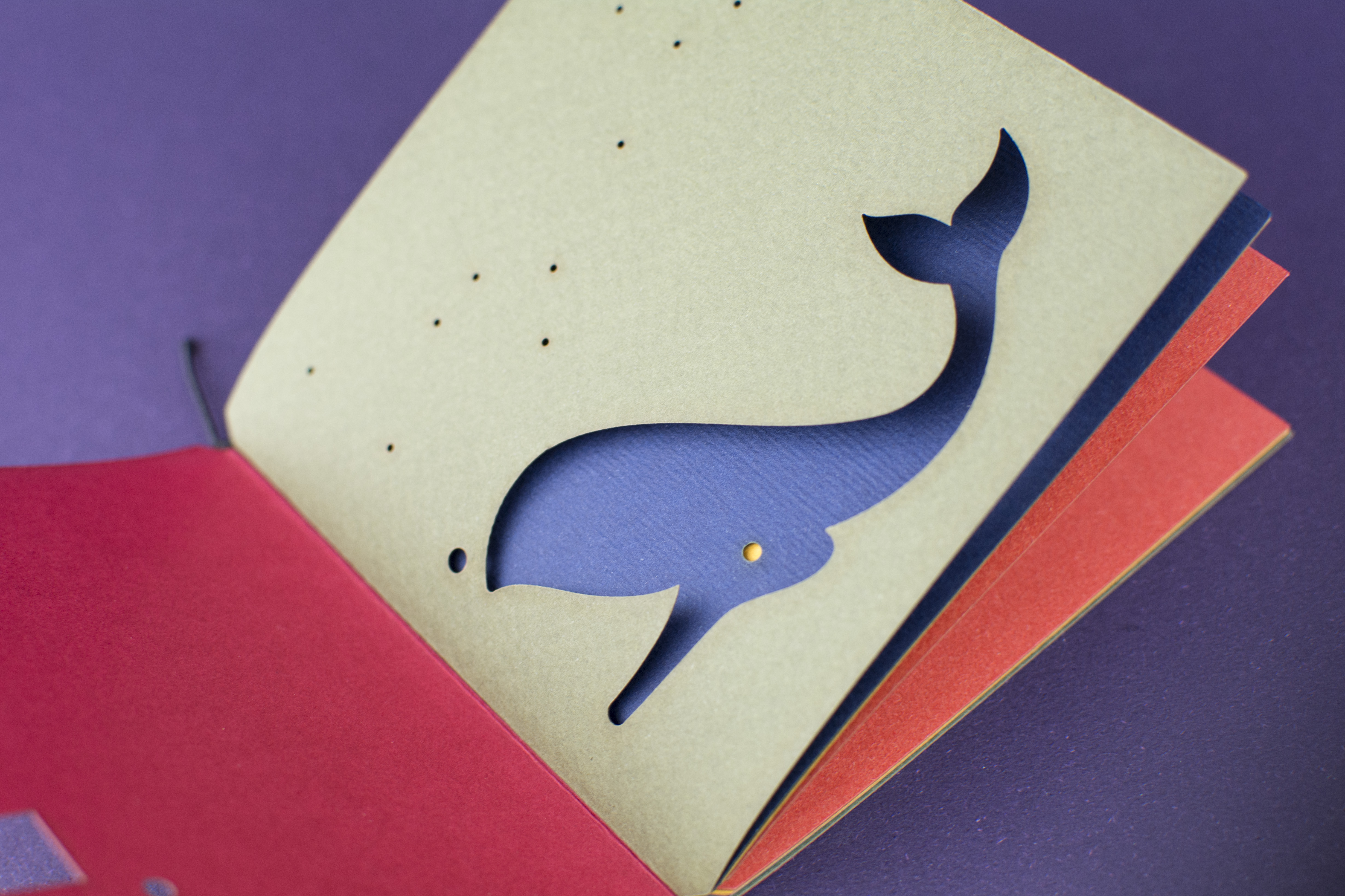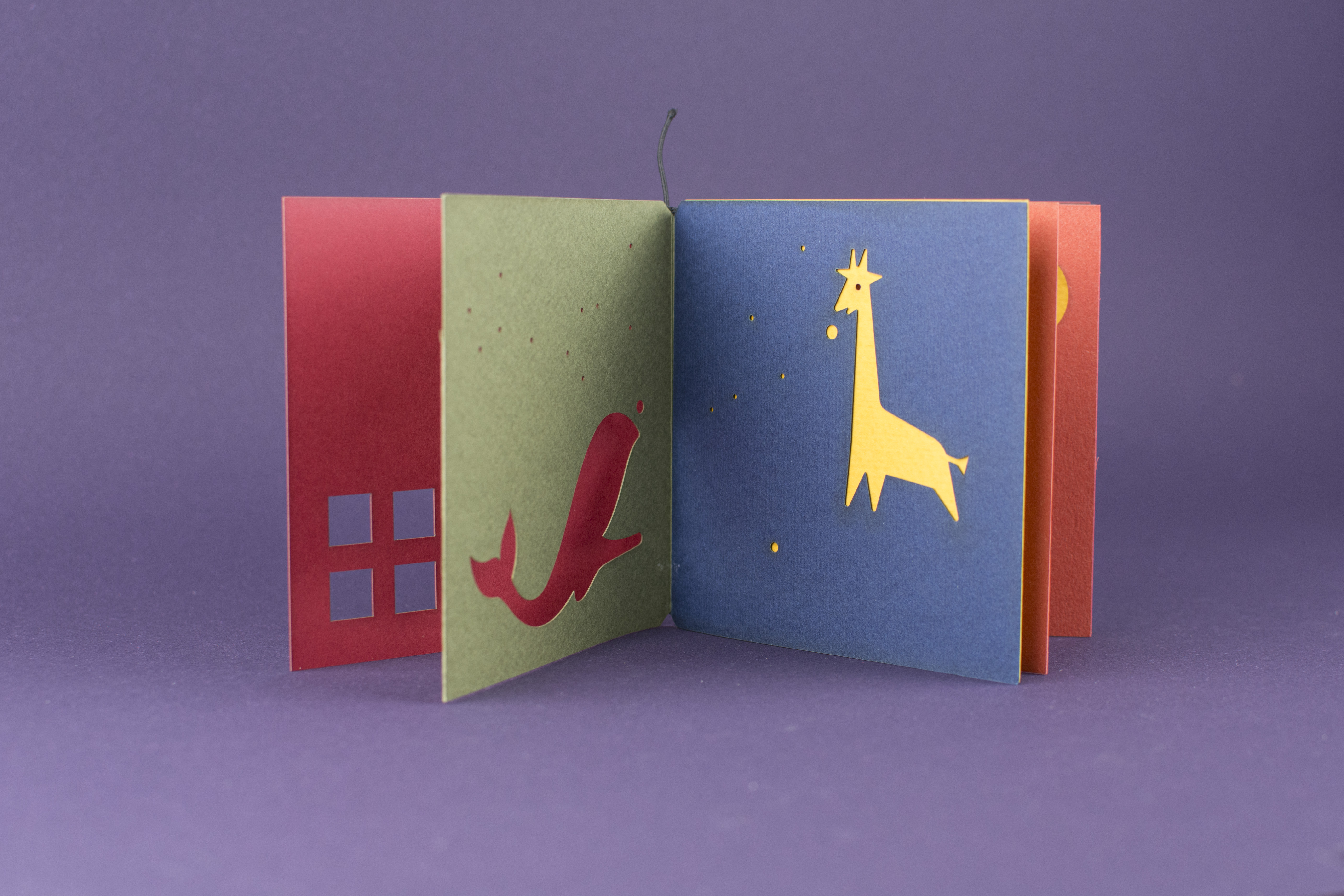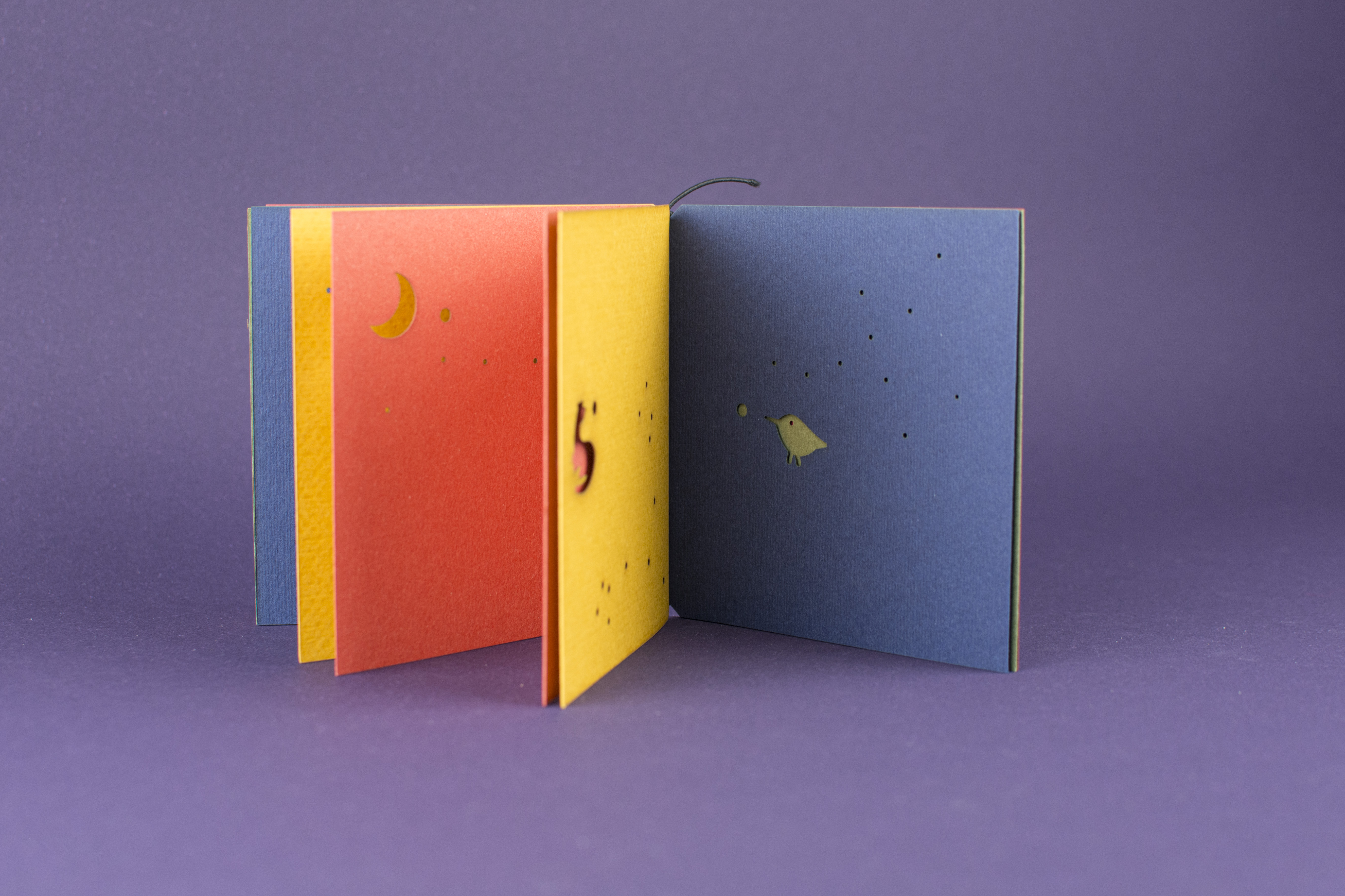 Le livre, sans texte, propose au fil des pages de découvrir un animal et la constellation qui lui est liée. Le travail d’illustration se fait entièrement au moyen de système de découpe de papier. Une attention particulière est portée aux matériaux et aux dimensions de l’objet. Chaque papier a une texture différente et la dimension de l’objet est pensée à l’échelle de la main de l’enfant. Enfin, la reliure se fait au moyen d’un élastique permettant à l’enfant de déconstruire le livre et de l’agencer différemment s’il le souhaite.